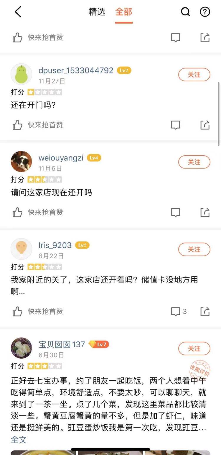而在点评网站上搜索“一茶一坐”,显示出的七宝万科店和江桥万达店都已标注“暂停营业”,另一则靠近地铁七宝站的门店词条中,“商户电话”一栏显示为“暂无信息”,评论中6月还有网友的消费评价,之后便都是“这家店还开着么”的提问,不少消费者都表示自己办了储值卡,想要尽快使用或是咨询退卡事宜。