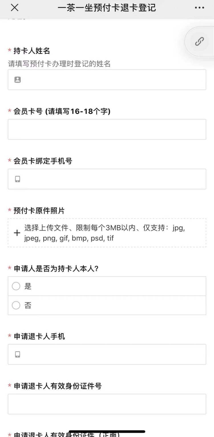 周到君扫描了二维码看到,消费者在进行退卡登记时,需要填写持卡人姓名、会员卡号、绑定手机号、预付卡原件照片、申请退卡人手机、申请退卡人有效身份证件号和证件照片,以及支付宝退款账号等信息。