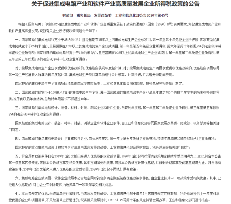 公告指出,国家鼓励的集成电路线宽小于28纳米(含),且经营期在15年以上的集成电路生产企业或项目,第一年至第十年免征企业所得税;集成电路线宽小于65纳米(含),且经营期在15年以上的,第一年至第五年免征企业所得税,第六年至第十年按照25%的法定税率减半征收企业所得税;集成电路线宽小于130纳米(含),且经营期在10年以上的,第一年至第二年免征企业所得税,第三年至第五年按照25%的法定税率减半征收企业所得税。