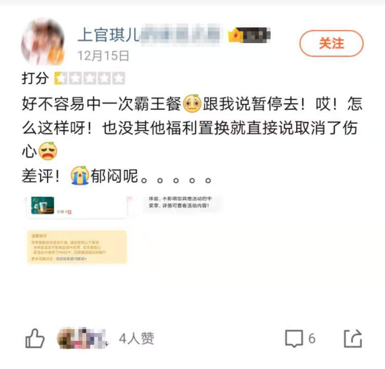 网友“上官琪儿”就是因门店暂停营业,而来不及兑换“霸王餐”的一员。她说:“好不容易中了一次霸王餐,跟我说暂停了,也没有其他福利置换,伤心。”