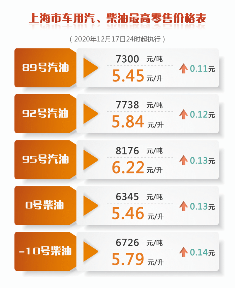 上海成品油价明起上调,加满一箱92号汽油大约多花6元! 沙情奕 2020-12-17 来源:周到上海 根据国家发改委通知,12月17日24时起,成品油价格上调,上海同步实行。92号汽油为5.84元/升,95号汽油6.22元/升,0号柴油5.46元/升,按一般家用汽车油箱50L容量估测,加满一箱92号汽油约多花6元。(注:98号汽油为企业自主定价。) 注:表中汽油和柴油价格为符合第六阶段强制性国家标准ⅥA车用汽油价格和Ⅵ车用柴油价格。 92号汽油价格走势↓↓ 来源:周到上海 作者:沙情奕 赞一个 (0)