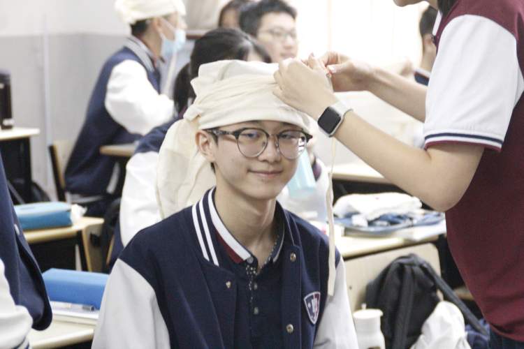 比如,盛晓涵在高一军训时接受的急救技能培训,就包括两个半天共计8课时的内容,涵盖止血、包扎、固定、搬运,心肺复苏等内容;理论与实操结合,考核通过后,学生们还会收到区红十字会发放的紧急救护技能证。