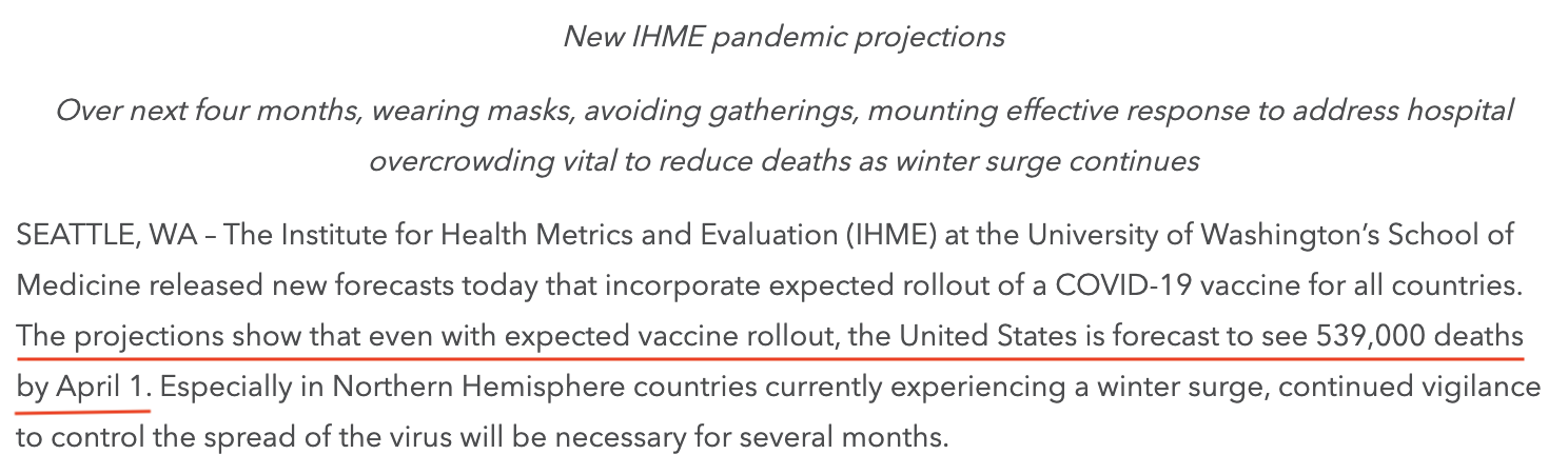 公共卫生专家表示,美国今年冬天因新冠肺炎死亡的人数还将继续上升,疫苗对减缓今年冬天的“疫情洪流”几乎没有作用。华盛顿大学健康指标和评估研究所的模型预测,即使在预期的疫苗投放情况下,到2021年4月1日,全美的新冠肺炎死亡病例数将有约53万。