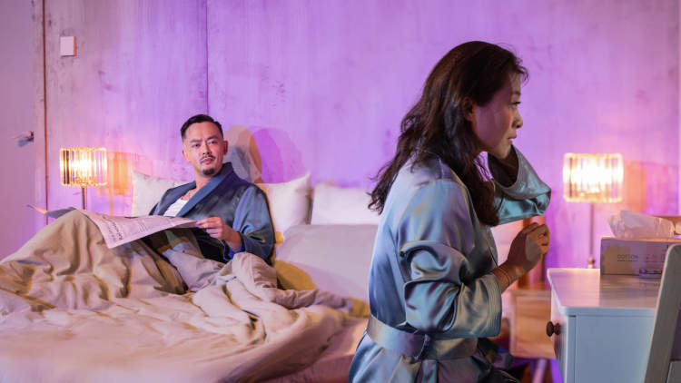 2020年版本《真相》和《谎言》的舞美布景,意图用流畅的,有节奏感的场景转换来带动剧情的发展,因此选用了转台的方式来呈现不同的场景。特别是《真相》中的前三场,剧中演员将连续进入三个房间,躺在三张床上,与两个不同的女人进行交流,转台的流动性使之成为一个有趣的动线画面。在空间的布置上,尽可能的还原了现实家居空间的大小和家具的布置,灯光也将多用家居灯的效果而非舞台灯具。
