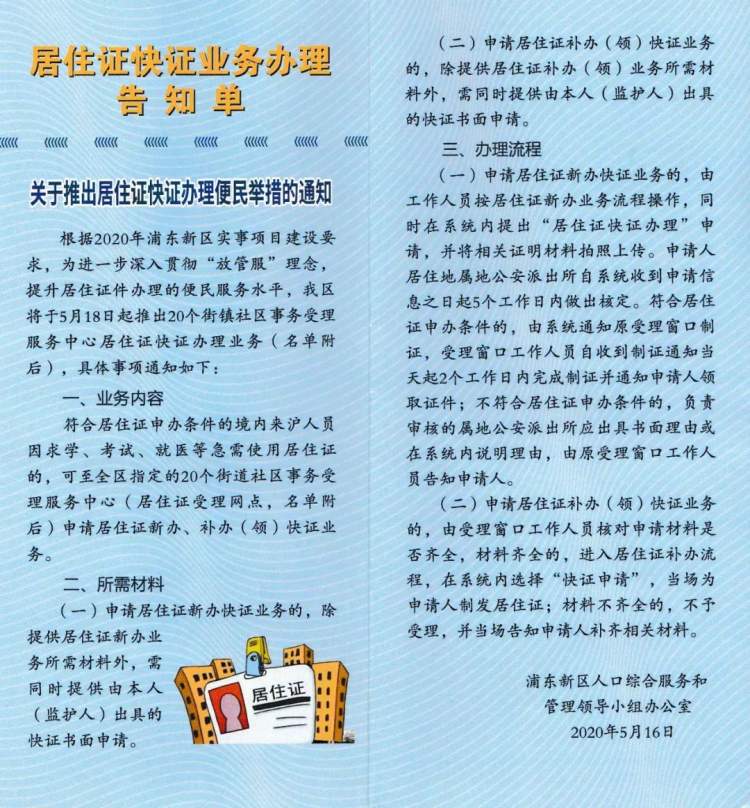 居住证“快证”是上海市为更优质、便捷、高效地服务群众、企业及社会各方,推出的便民服务。2019年10月15日起,全市推出居住证快证服务,即求学、考试、就医等急需使用居住证办理业务,浦东陆家嘴街道、康桥镇、宣桥镇社区事务受理服务中心首批启动此业务。2020年5月18日起,浦东又新增覆盖17家社区事务受理服务中心。
