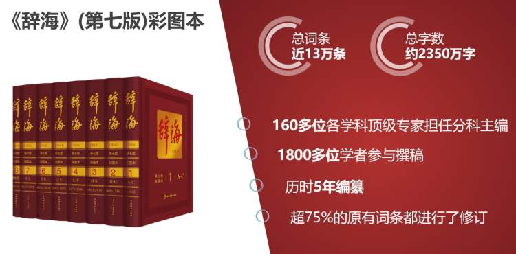 《辞海》(第七版)于2020年9月上市,目前累计发行达40000套。同时,本版《辞海》同步推出网络版。有声、有色、有形,覆盖各类终端,可以满足用户随时随地的知识查询需求。