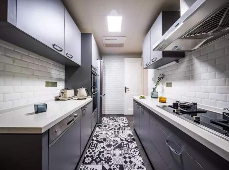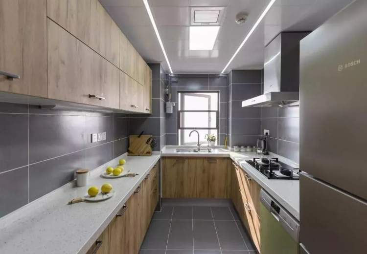 双线型布局对厨房的宽度有要求,除去两边的橱柜宽度,中间过道的宽度最好在90cm以上,让人有足够的空间弯腰取橱柜里的东西。