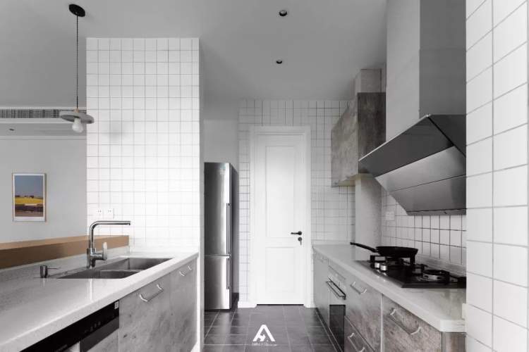 一字型厨房的动线比较长,做菜顺序一字排开:储藏区(冰箱)—水槽(洗菜)—加工区(切菜)—烹饪(灶台)—备餐区(装盘备用),这样的布局才能再大程度上减少走动,让做饭变得流程清晰、区域分明。