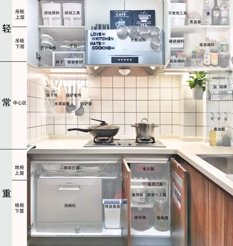 比如做一餐晚饭,要从冰箱里拿出食材—洗菜—切菜—放进盘子里备用—开火炒菜—放调料—出锅—装盘,这就涉及到四个区域:储物区、洗涤区、备餐区、烹饪区,在不同的厨房布局中合理布置这四个区,才能让下厨变得更加简单,做一餐晚饭手到擒来。
