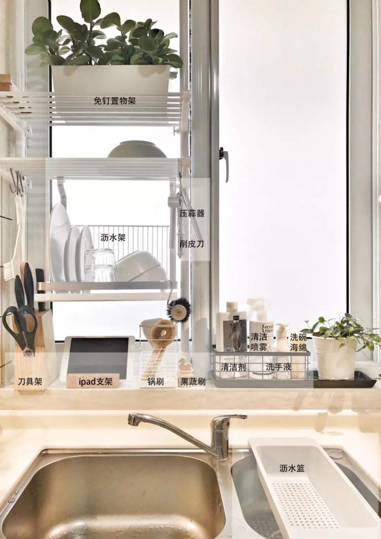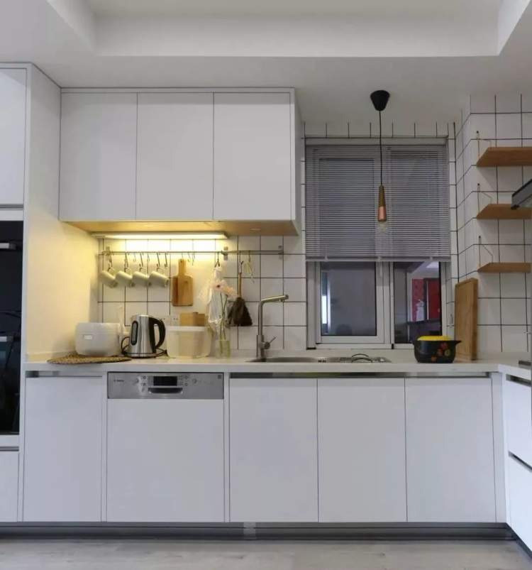 利用空白墙面设计收纳功能,例如搁板、置物架、洞洞板等上墙,挂杆+挂钩的搭配,Z大化利用空间的同时,也能让烹饪中的你随手拿到想要的工具或调料。