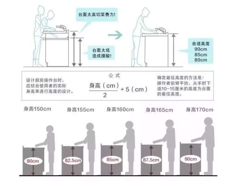 水槽台面与切菜台面通常要用到腰部力量,如果锅底,洗菜切菜会感觉腰部酸痛,那如何计算适合自己的舒适高度呢?