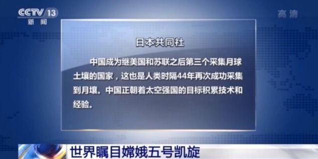 日本共同社报道说,中国成为继美国和苏联之后第三个采集月球土壤的国家,这也是人类时隔44年再次成功采集到月壤。中国正朝着太空强国的目标积累技术和经验。
