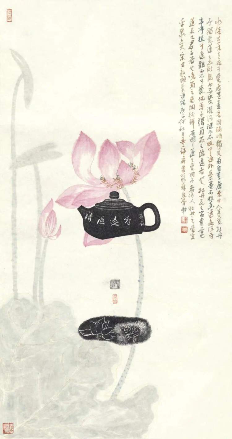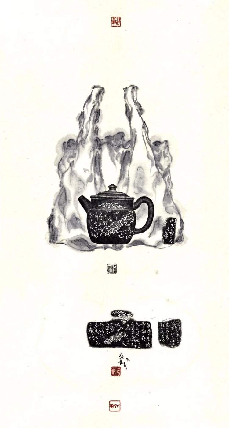 而今天,当我们走进《游壶》展的展厅,对紫砂壶的既有认识一下子被刷新了。五位文人艺术家不但在紫砂壶上创作书画,阐释了他们对壶艺、茗茶、人生和世相的深度认识之外,还用全形拓这一神奇的传拓技艺,将紫砂壶型和壶面书画传拓至宣纸上,而五位艺术家还在宣纸上创作了相关的书画作品。诗文题跋、书画创作、全形拓印、紫砂壶艺四美合为一体,在文人壶领域实现了一次前无古人的跨界合作。