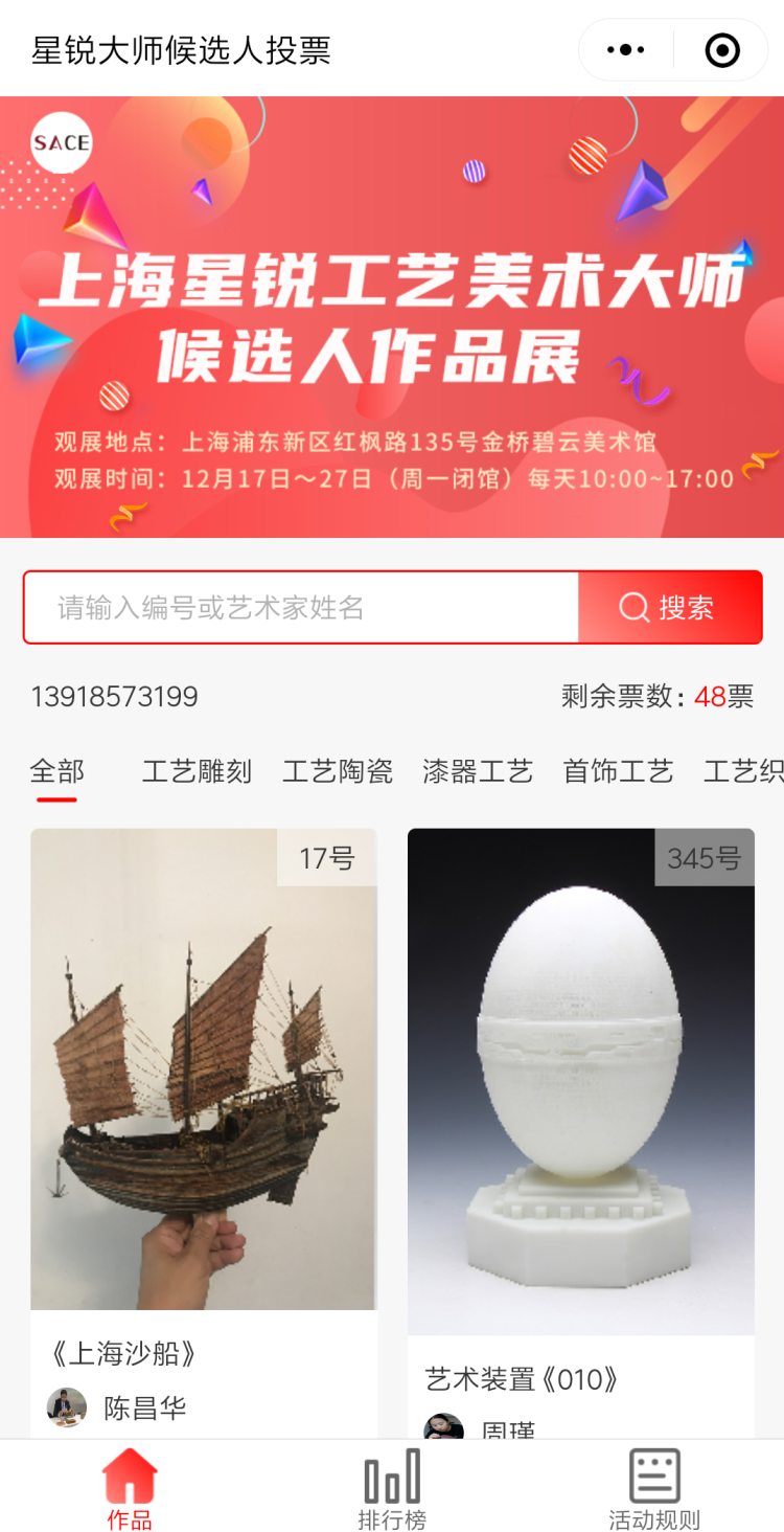 12月17日,“传承经典·醉美中国”上海星锐工艺美术大师候选人作品展在金桥碧云美术馆开幕。市民搜索“上艺荟”查看小程序,即可参与展览作品的网上投票。