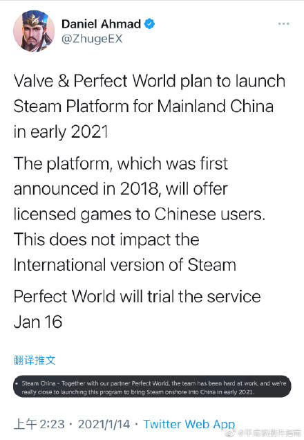 Valve官方还表示将与合作伙伴完美世界携手。具体官宣信息如下:“将携手我们的合作伙伴完美世界,我们的团队孜孜不倦地工作,很快就能启动于 2021 年初让 Steam 登陆中国的项目。”
