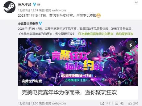 而早在2020年12月21日, 沉寂很久的蒸汽平台官博突然更新。消息指出,完美世界最快将会在 1 月 16 日开始测试该服务。到时候,玩家就可以在1月16日-17日举办的完美电竞嘉年华现场体验试玩。↓