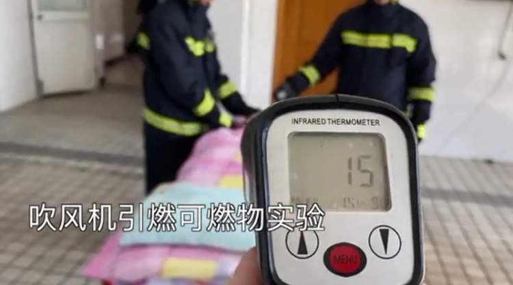 ▲金山消防曾做过实验,工作中的吹风机30多秒就可能引燃被褥