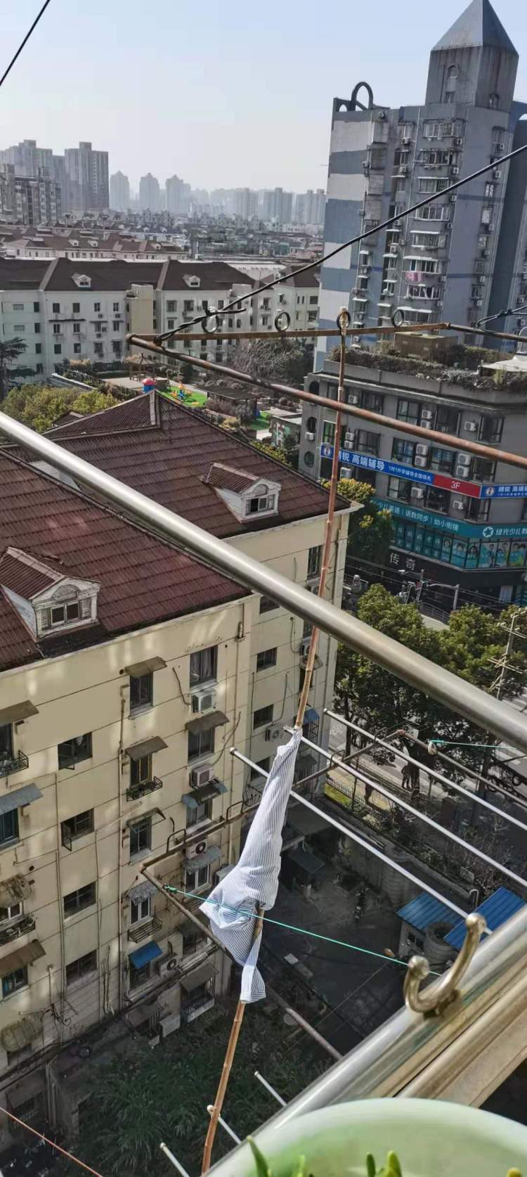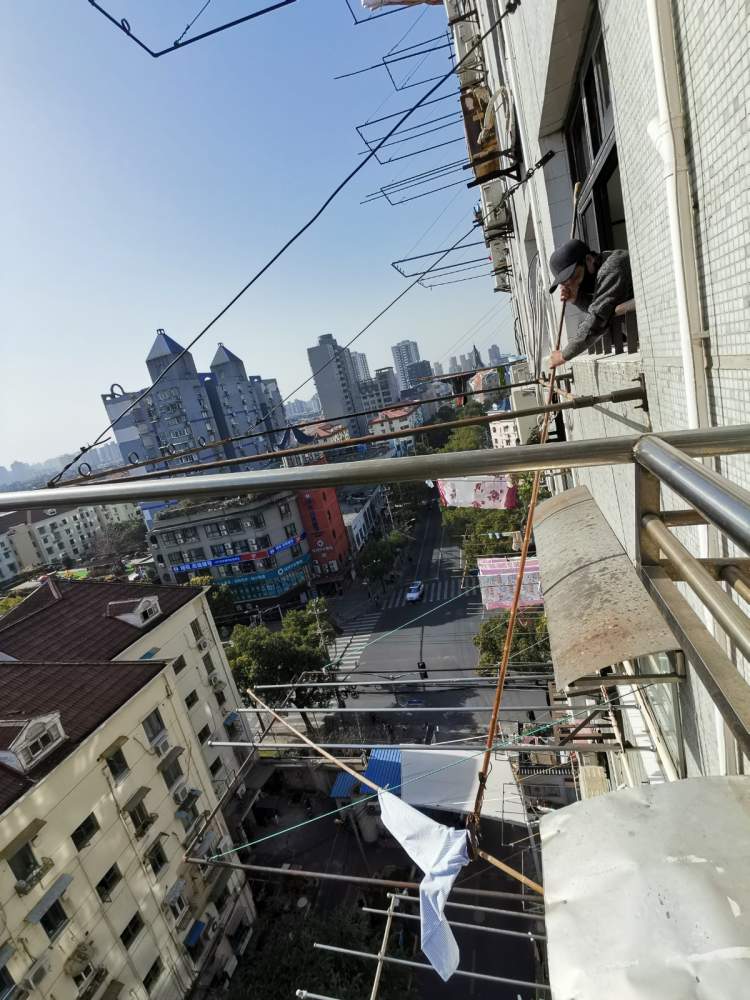 来到位于11楼的居民家中,只见阳台上的晾衣杆早已被大风吹得移位,斜斜地悬在半空中正摇摇欲坠,随时有掉落的可能性。这户人家是一对高龄夫妇,碰到这样的突发情况,他们两个人措手不及、不知所措,好在有一位热心的邻居李女士见状后及时向丰镇二居委报告并求助。随后,在大家的齐心协力下,插在楼下邻居家雨棚处的晾衣杆终于被安全地取回屋中,这才排除了险情。