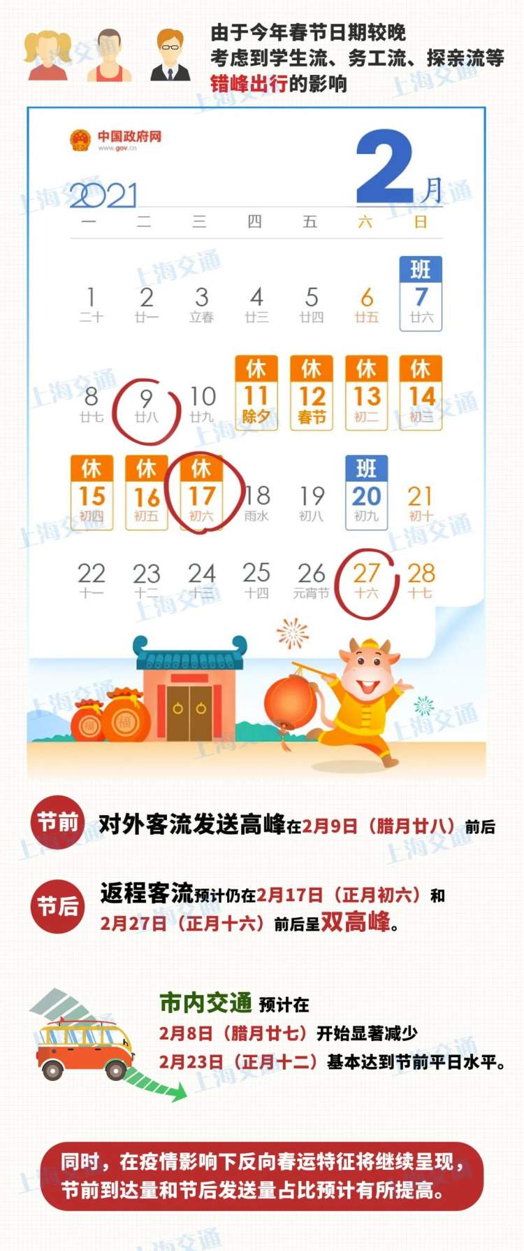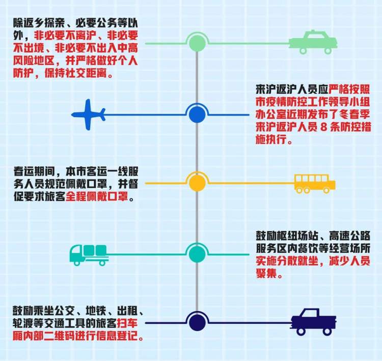 近期,市疫情防控工作领导小组办公室发布冬春季来沪返沪人员8条防控措施,总体防控要求和减少流动政策导向,将对春运客流产生不确定影响。详见下文: