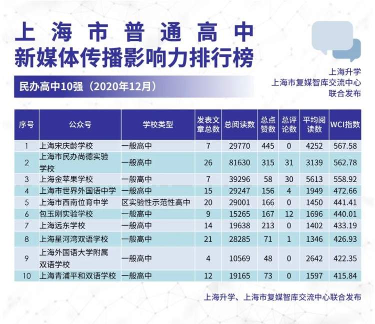 而在上海市普通高中新媒体传播影响力排行榜民办高中10强(2020年12月)中,名列前三的微信公众号分别是“上海宋庆龄学校”、“上海市民办尚德实验学校”、“上海金苹果学校”。