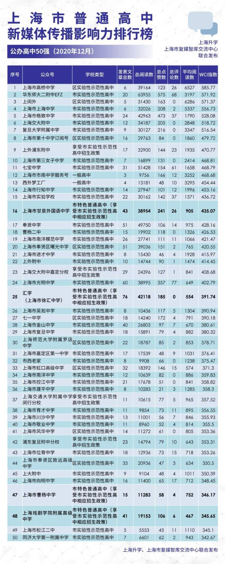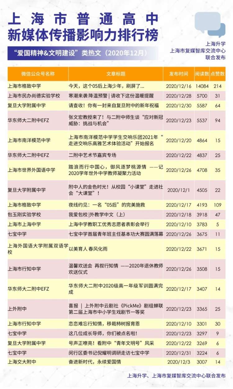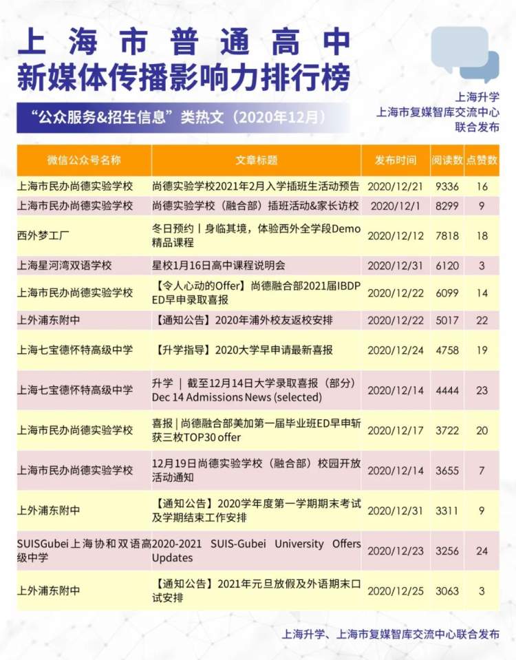 上海升学、上海市复媒智库交流中心联合发布上海普通高中新媒体2020年12月传播影响力排行榜