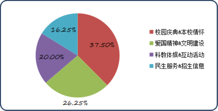 在80篇热门文章中,“校园庆典&本校情怀”类文章的数量位列榜首(占比37.50%),“爱国精神&文明建设”(占比26.25%)位列第二,“科教体娱&互动活动”(占比20.00%)位列第三,“民生服务&招生信息”(占比16.25%)位列第四。
