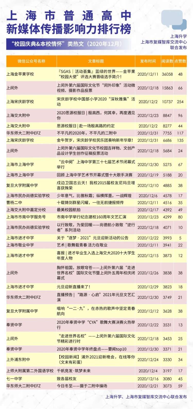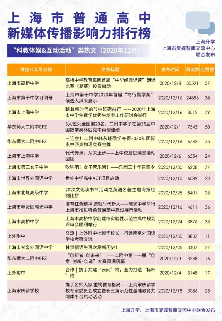 聚焦上海普通高中新媒体建设,引导各校传递教育正能量、发出校园好声音,上海升学牵手上海市复媒智库交流中心,联合发布上海市普通高中新媒体传播影响力排行榜(2020年12月)。