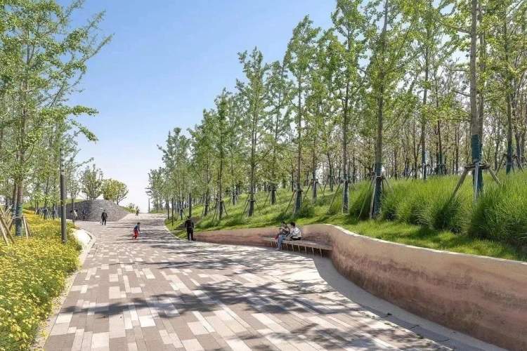 树木和植被郁郁葱葱地分布在行道两侧,行人可以清晰地观赏到由北向南的都市人工次生林-人工疏林草地-赏花园区的过渡景象。一系列拱桥和水中小岛连接溪谷两岸,形成静谧的亲水界面,与中央水道两侧的水杉和杨柳,最大限度地模糊城市与自然的边界,营造令人难忘的都市生活栖息地。