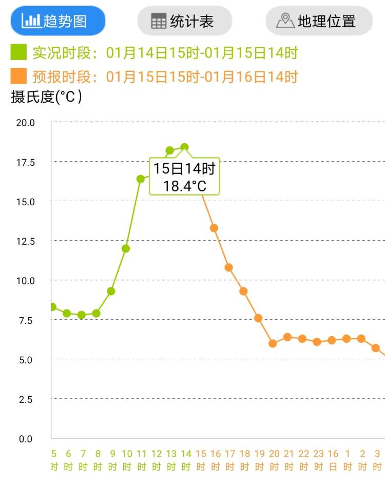从气温逐时趋势预计来看,气温折线拐点差不多就要出现,直线降温要开始了。