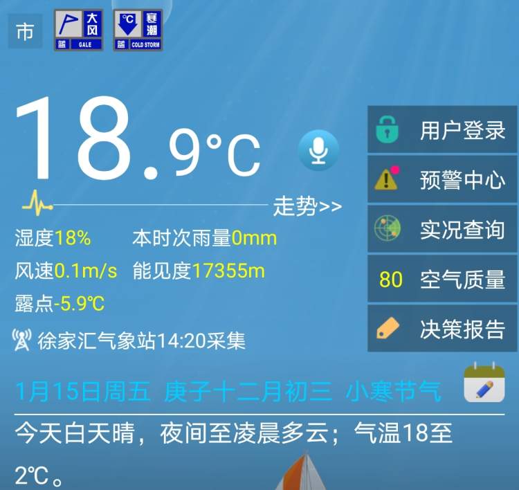 但在这个较高气温出现的同时,上海还挂着寒潮蓝色预警和大风蓝色预警。