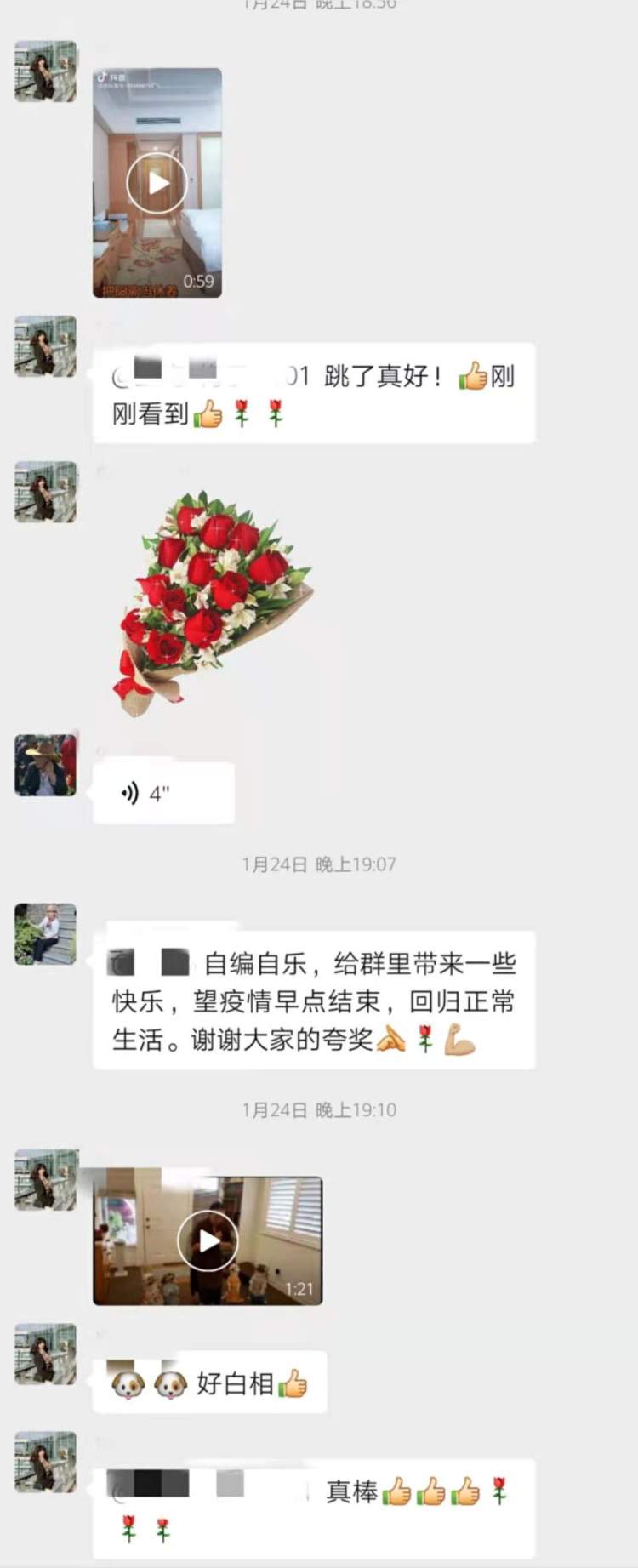 再到后面,微信群的力量愈发凸显出来。居民有猜测,及时科学引导;居民有情绪,马上进行安抚;居民有困难,第一时间相互支持。从群里讨论到落地实施,邻居间互相帮扶、互相监督,形成了隔离点内部互助式抗击疫情的良性循环,“隔离不隔心”已经成了大家共同抗击疫情的道德准则。十多天的隔离,让那些平日里见面不打招呼的邻居们,在这段时间慢慢熟络起来,有的居民甚至还找到了小时候的伙伴。“疫情也使大家变成了‘战友’,群里有位姐姐格外乐观,用她的话说,既然没法出门就把隔离当成一次修养。” 这位居民姐姐每天都会将自己练习跳舞的视频分享到群里,让有兴趣的居民可以跟着学,曼妙的身姿加上她积极乐观的态度,无形中在感染着身边的人,大家在群里一起守望胜利。