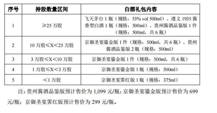 不过这个赠礼厚薄不同,分为5个等级,最高持股25万股或以上的股东的白酒礼包包含:飞天茅台1瓶(规格:53%vol500ml)、遵义1935酱香型白酒1瓶(规格:500ml)、贵州酱酒品鉴版1件(6瓶)等,价值近1万元,而最低持股小于1万股的股东获得的是京御圣宴霁红版1瓶(规格:375ml),预计售价299元。