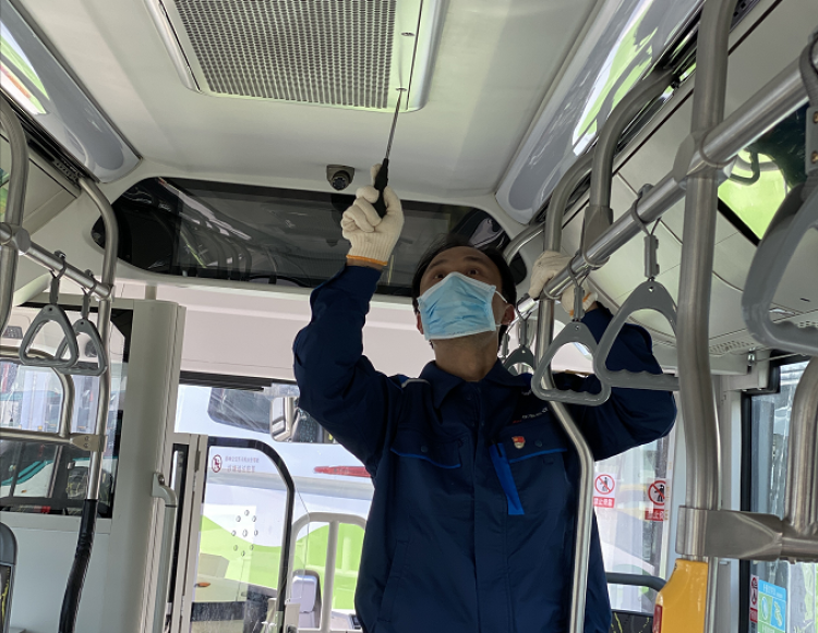 李君在拆卸公交车空调滤网