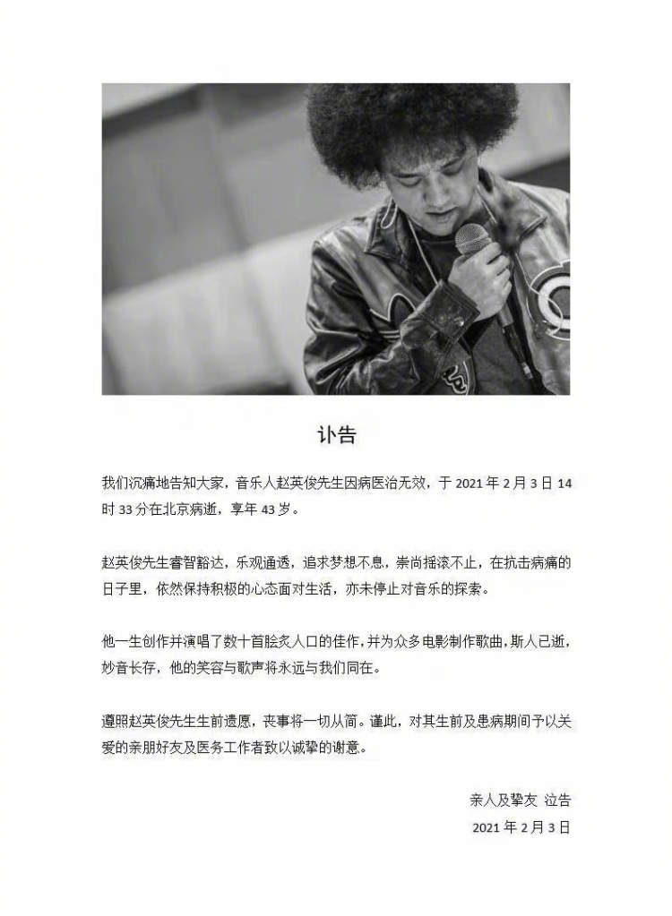 2月3日14点33分,音乐人赵英俊在北京因癌症去世,享年43岁。