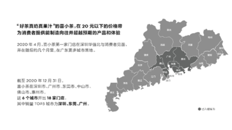 喜小茶延续喜茶追求极致的品牌精神,坚持使用好茶真奶真果汁,在与喜茶不同的价格带为消费者提供能制造向往并超越预期的产品。自2020年4月喜小茶首家门店落地深圳华强北乐淘里后,随着喜小茶产品口碑的不断累积,喜小茶初步形成自身的品牌势能,并在2020年底于深圳、广州、东莞、中山、佛山、惠州6个城市落成18家门店。