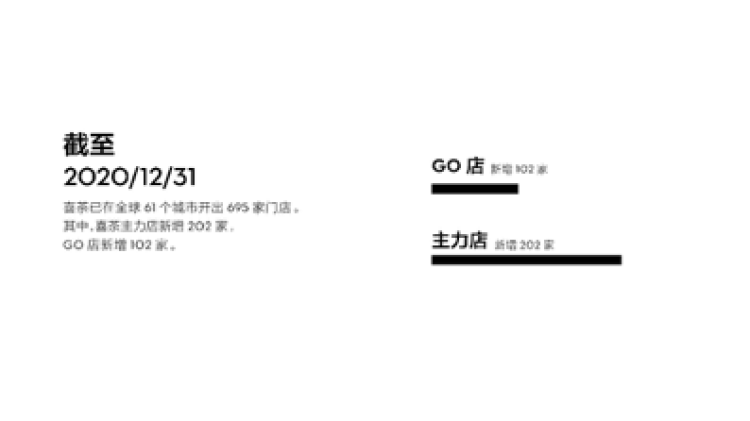 2020年喜茶在门店形态上也积极探索、创新,全年新增202家主力店及102家GO店的同时,还结合门店所在城市的地方文化,激发灵感,开出多家灵感特色门店,包括上海新世界大丸百货黑金店、广州永庆坊店、深圳海岸城环保主题店、深圳京基KKMALL店和成都宽窄巷子店在内的灵感特色门店,为消费者带来现代、古典、环保等不同风格的灵感空间体验。