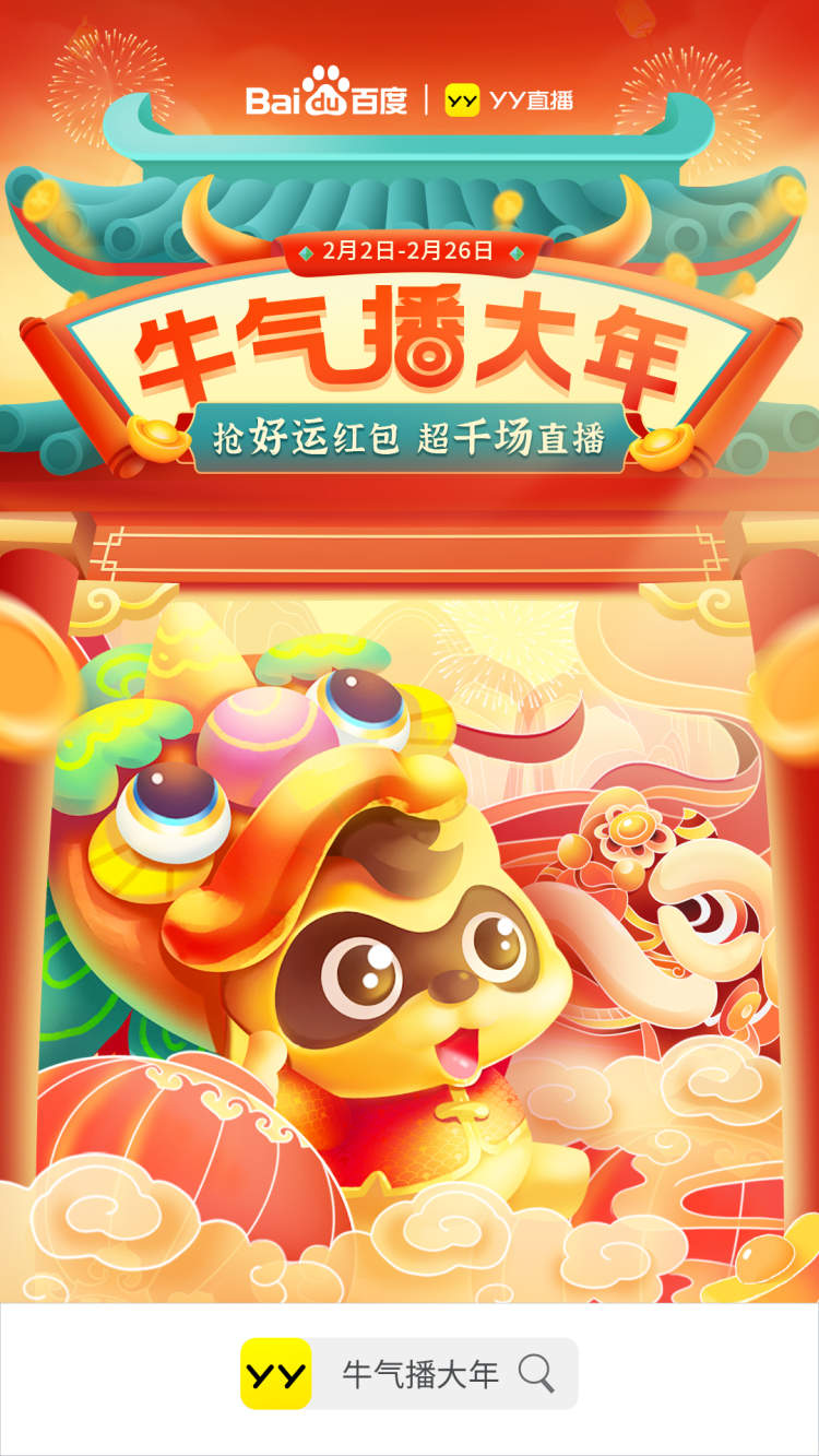 近日,YY直播启动“牛气播大年”活动,时间从2月2日开始持续到2月26日,期间,YY直播APP将和百度一起发好运红包。