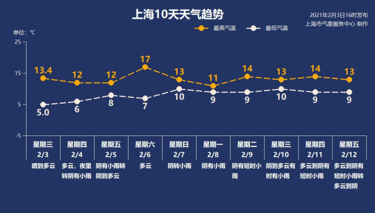 明后两天,申城的温差也将缩小:最高在12℃左右,最低在6-8℃。