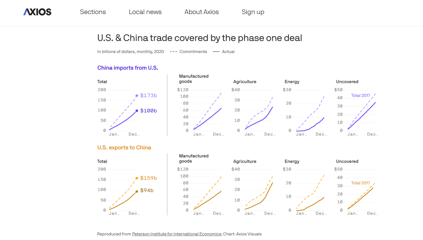 美国对中国发起贸易战阶段的美中贸易数据。(美国新闻网站Axios)