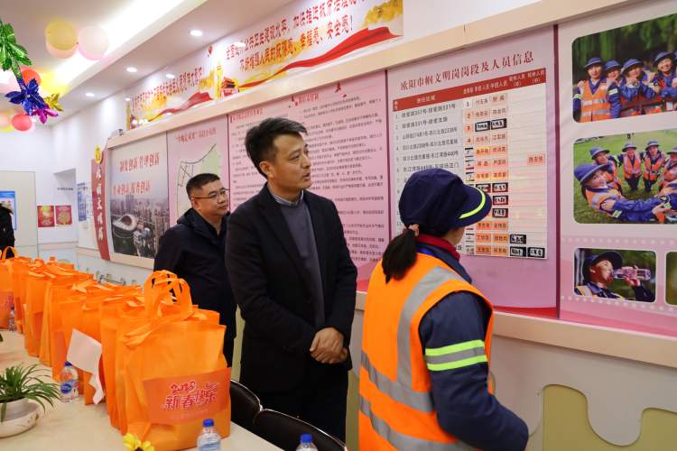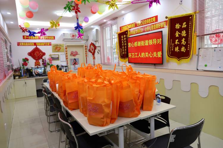 农历辛丑年春节前夕,欧阳路街道党工委为确保留沪外来建设者过个幸福美满的新春佳节,开展了“他乡遇故乡,四香解思乡”主题活动,向来沪建设者赠送过年“大礼包”(包括姜茶、暖宝宝、护手霜、手织绒线帽等)。街道党工委书记王磊,街道党工委副书记、办事处主任黄海滨等街道领导还来到位于东体育会支路上的上海东虹环境保洁有限公司“巾帼文明岗”,将街道精心准备的丰盛的年夜饭套餐送到道清班组职工手中,向他们送上新春祝福和慰问。