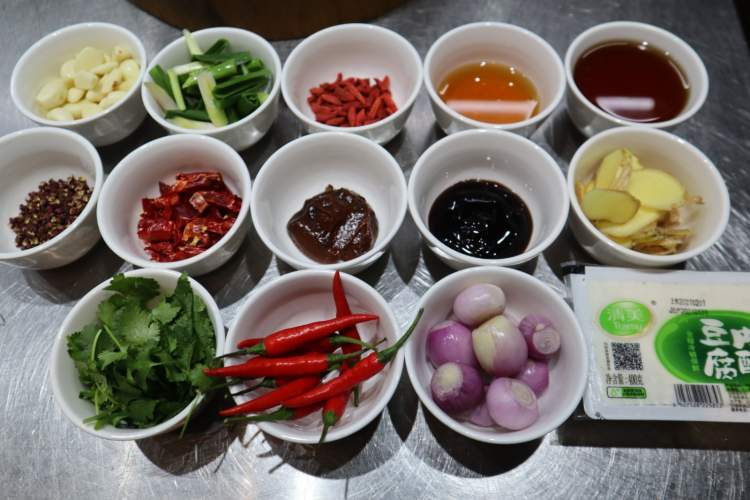 接下来放蒜头煎香,放黄酒去腥、加入干辣椒和小洋葱碎增香、放一小勺豆瓣酱,这样炒制部分就结束了。