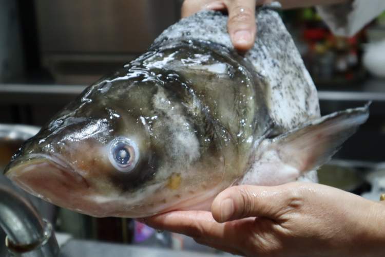 徐俊告诉周到君,选用的鱼头是来自河南信阳水库里的花鲢鱼,它是用液氮保鲜的,所以新鲜度更好。“这次鱼头比较大,如果家里烧,在菜场买些小鱼头也可以。”