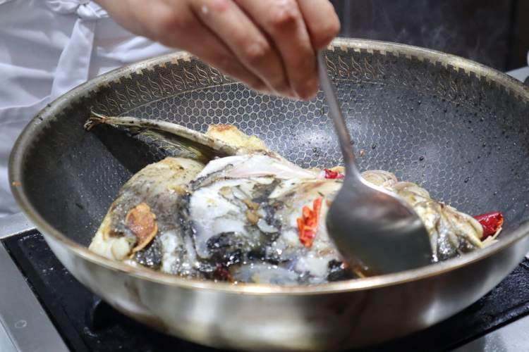 一般人家里做鱼头汤可能直接就加水熬,那味道就浅淡些,徐大厨透露了一个使汤更鲜美的妙招:加鱼汤。