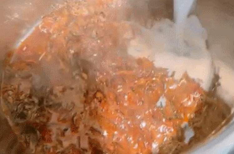 在锅中倒入准备好的牛奶,此时由于锅热,焦糖会有点结块现象,但没关系,再加热搅拌一会,糖自然就融了;