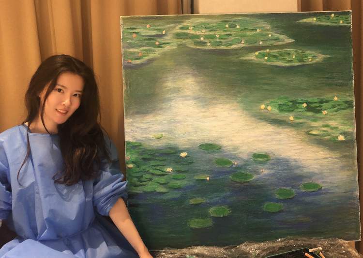 隔离的日子里,王敏经常做VLOG,还有做画。不是画“无脸怪”这样的卡通画,而是临摹“睡莲”,是的,莫奈晚年最喜欢的创作对象。每次隔离,王敏会订购1乘1米的画布,然后每天静静地画上三四个小时,等隔离结束,一副作品也就诞生。我曾经惊叹地发过朋友圈,有人留言说:想买,拍卖吗?我回:我还想买呢,别插队。