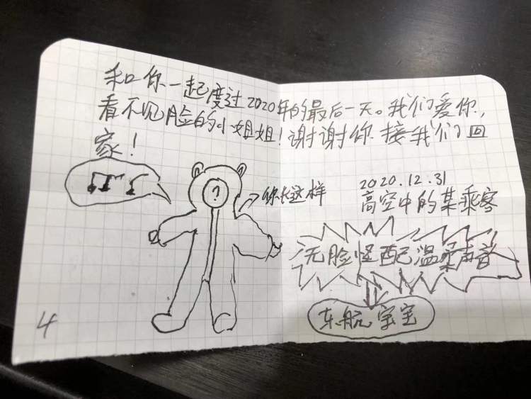 在信的最后,小乘客还画了穿防护服空乘的“素描”,额,我怎么觉得更像卡通画,有点可爱……王敏她们又被称呼为“无脸怪+温柔声音”……