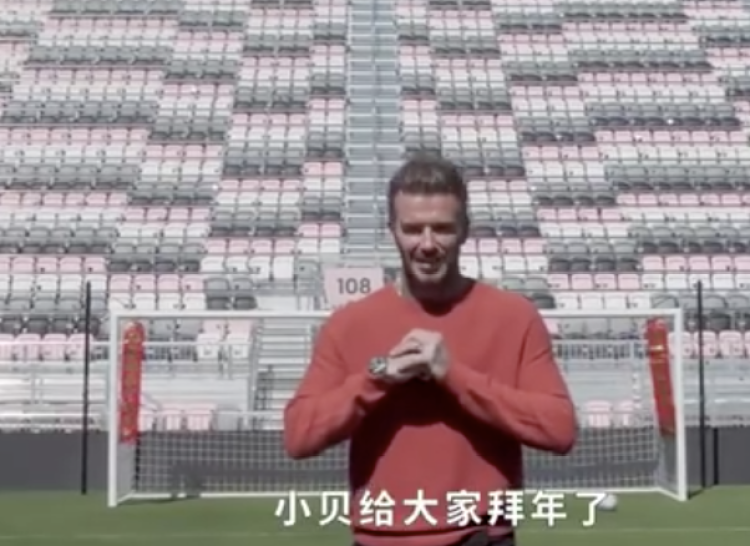 在把球打入空门后,特意穿着红衣的贝克汉姆自称“小贝”,并给粉丝们拜年,一段中文说得也是颇为拗口,不过也算用心了。