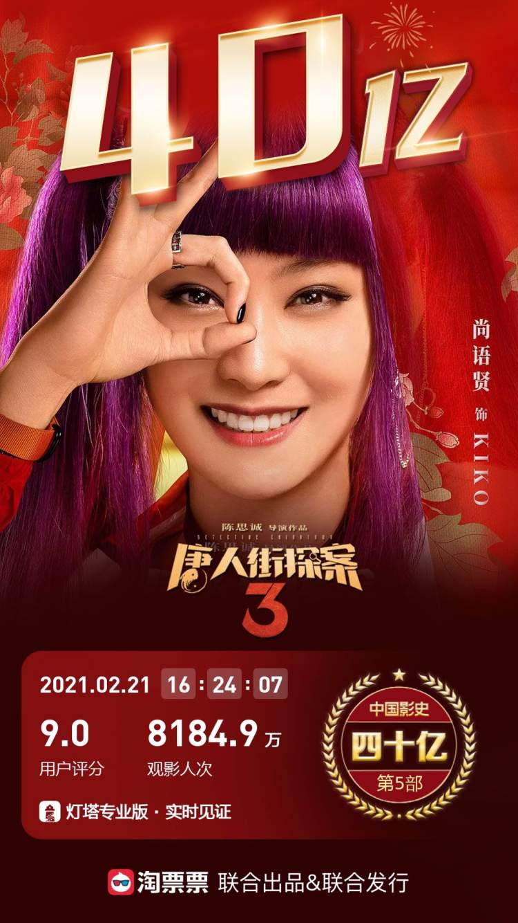 就在刚刚,在《唐人街探案3》上映第10天,该片累计票房正式突破40亿元,成为中国影史第5部票房破40亿的电影。