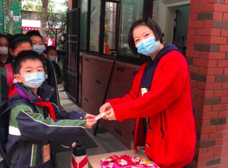 早上六点五十左右,学校门口等待孩子们归来的老师们已经就位,他们身边放着一大盒提前准备好的牛年红包。