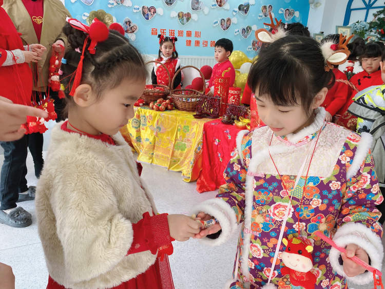 每位来园的幼儿都收到一颗甜甜蜜蜜的糖果,寓意新的一年生活甜甜蜜蜜;一个萌萌的牛年生肖挂饰,祝福大家牛气冲天;一句美好的新年祝语,送出彼此的关怀与爱意;一个暖暖的拥抱,诉说彼此的友谊。